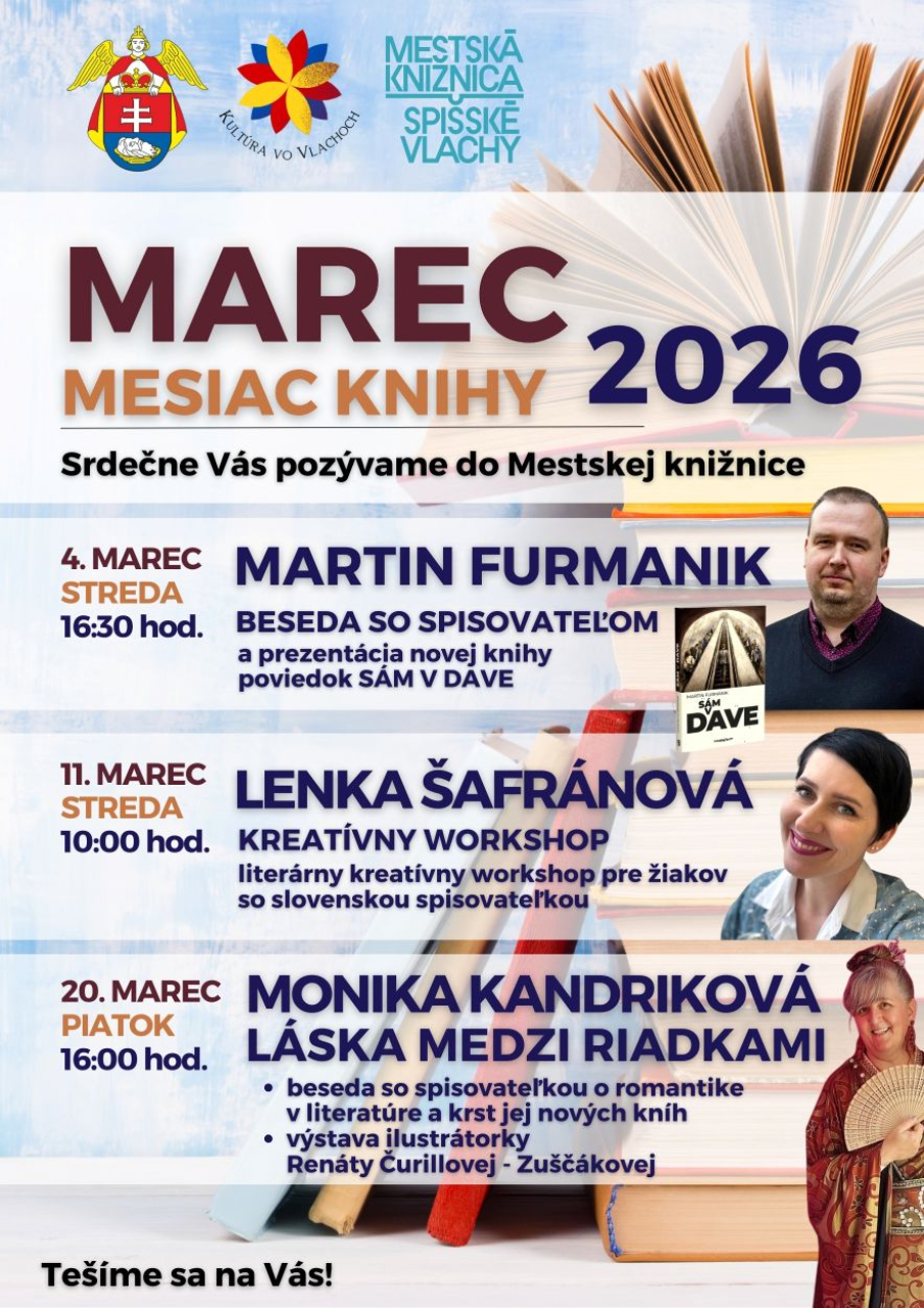 - 20. marec (streda) o 16:00 hod. - „Láska medzi riadkami“ – beseda so spisovateľkou Monikou Kandrikovou - rozhovor o romantike v literatúre a krst jej nových kníh. Súčasťou podujatia bude aj výstava ilustrátorky Renáty Čurillovej - Zuščákovej. Príďte si po inšpiráciu a nové literárne zážitky. Tešíme sa na Vás v mestskej knižnici.