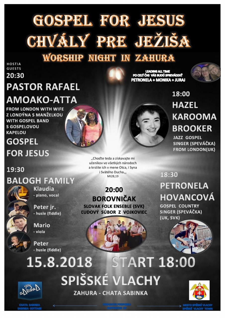 V stredu 15. augusta sa v oblasti Zahura v aeráli chaty Sabinka uskutoční kultúrne podujatie: Chvály pre Ježiša zamerané na širenie božej lásky a slova piesňami a svedectvami zo života. Súčasťou podujatia sú koncerty slovenských interprétov, a to Petronely Hovancovej – country a gospelovej speváčky, ľudového súboru Borovničak z Vojkoviec a rodinnej kapely Balogh Family. Na podujadí vystúpia aj zahraniční interpréti, a to Hazel Karooma Brooker – jazzová a gospelová speváčka z Londýna, pastor Rafael z Londýna s manželkou a s gospelovou kapelou Gospel for Jesus. Podujatie sa začína o 18:00 hodine. Organizátori podujatia sa tešia na Vašu návštevu. Viac v prílohe.