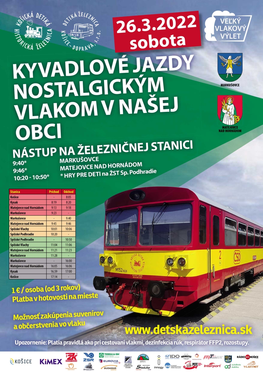 Detská železnica Košice pripravila kyvadlovú jazdu nostalgickou vlakovou súpravou na trase Matejovce nad Hornádom - Sp. Vlachy - Sp. Podhradie a späť. Odchod zo Spišských Vlách bude v sobotu 26.3.2022 o 10:06 h. smerom do Spišského Podhradia.