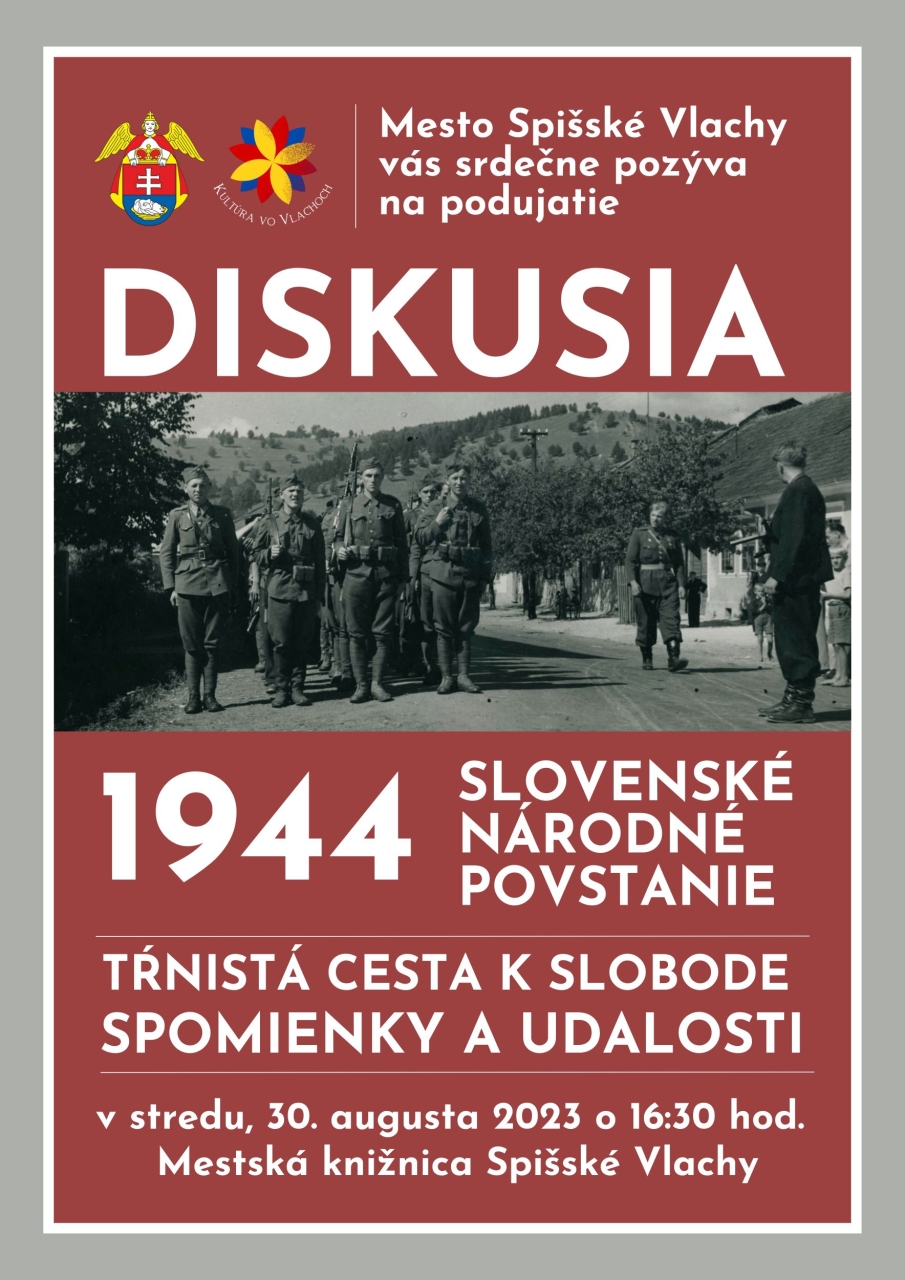 Mesto Spišské Vlachy Vás pozýva na DISKUSIU - SLOVENSKÉ NÁRODNÉ POVSTANIE - TŔNISTÁ CESTA K SLOBODE - SPOMIENKY A UDALOSTI, ktorá sa uskutoční v stredu, 30. augusta o 16:30 hod. v Mestskej knižnici. Všetci ste srdečne vítaní. Ak poznáte od svojich rodičov, alebo starých rodičov príbehy a udalosti, ktorá sa počas povstania stali v Spišských Vlachoch, alebo v okolí, srdečne Vás pozývame, radi si vypočujeme Vaše spomienky. Viac v prílohe.