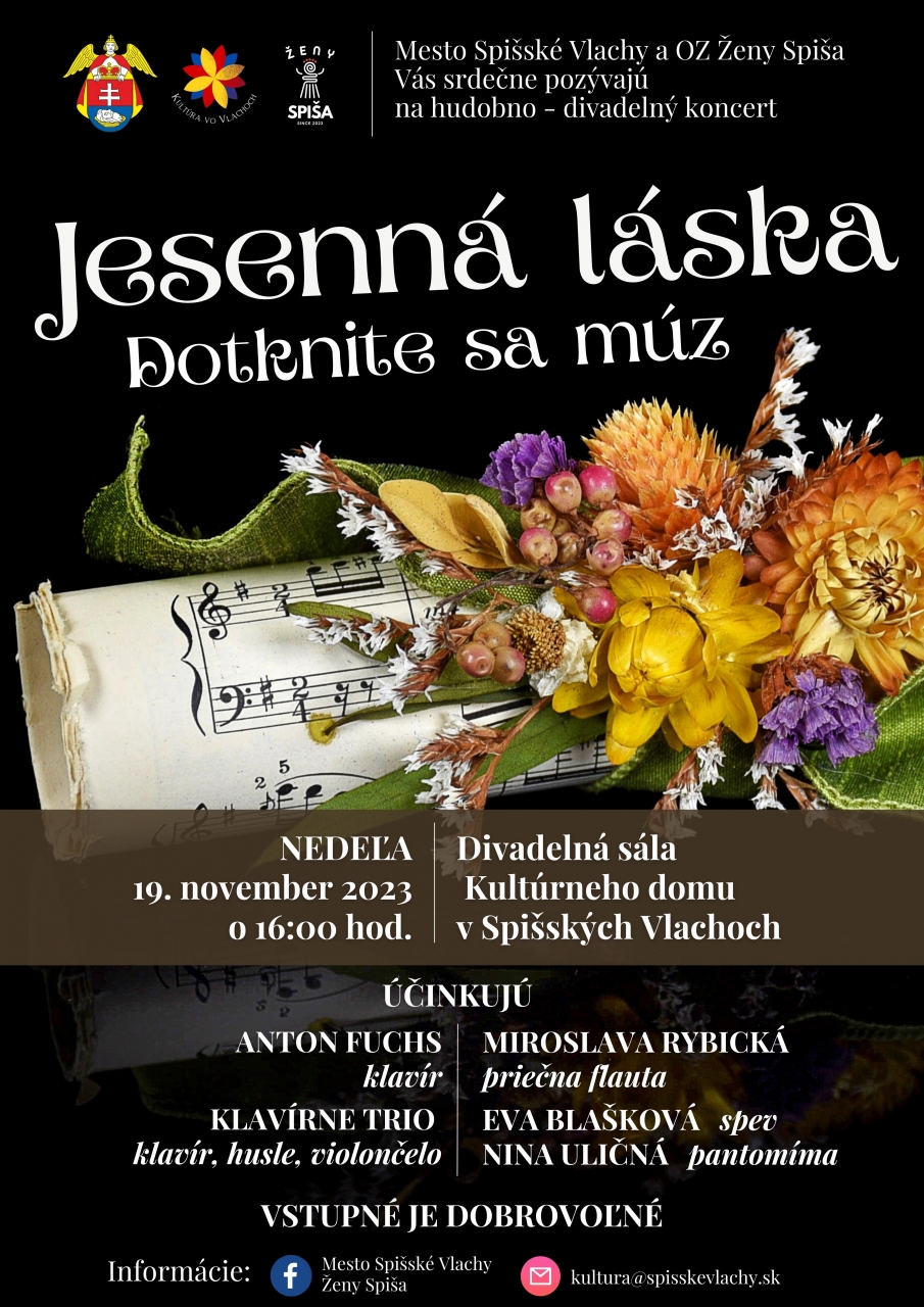Mesto Spišské Vlachy a občianska iniciatíva Ženy Spiša Vás srdečne pozýva na unikátny, hudobno-divadelný koncert JESENNÁ LÁSKA - DOTKNITE SA MÚZ, ktorý sa uskutoční v nedeľu, 19. novembra 2023, o 16:00 hod. v Divadelnej sále Kultúrneho domu v Spišských Vlachoch.