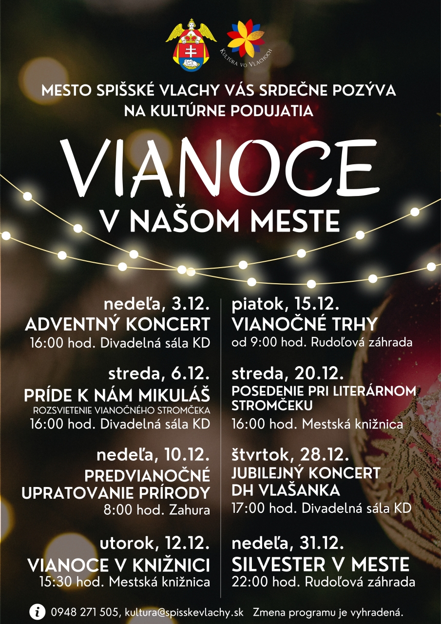 Vianočné sviatky sa blížia, čaká nás Advent a my pre Vás pripravujeme kultúrne podujatia, aby sme si spoločne s Vami užili tento krásny čas. Viac v prílohe.