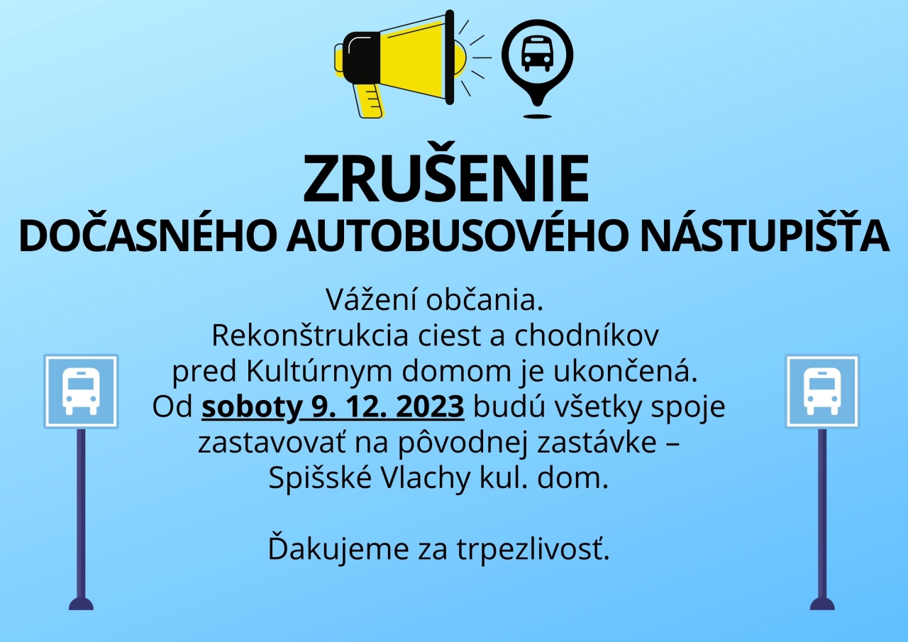 Vážení občania, rekonštrukcia ciest a chodníkov je ukončená. Od soboty 09.12.2023 budú všetky autobusové spoje zastavovať na pôvodnej zastávke - Spišské Vlachy, kultúrny dom. Ďakujeme za trpezlivosť.