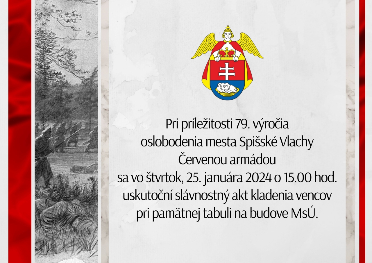Mesto Spišské Vlachy Vás pri príležitosti 79. výročia oslobodenia mesta Červenou armádou srdečne pozýva na pietny akt kladenia vencov, ktorý sa uskutoční vo štvrtok, 25. januára 2024 o 15:00 hod. pri pamätnej tabuli na budove MsÚ v Spišských Vlachoch.