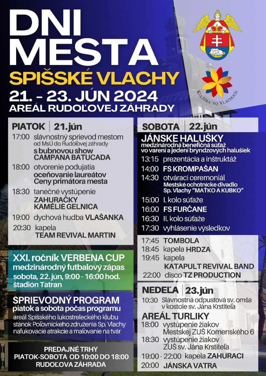 Vážení občania. Srdečne Vás pozývame na Dni mesta Spišské Vlachy 2024, ktoré sa uskutočnia 21. – 23. júna 2024 (piatok-nedeľa) v Rudoľovej záhrade a v areáli Turliky. Tešíme sa na stretnutie s Vami.