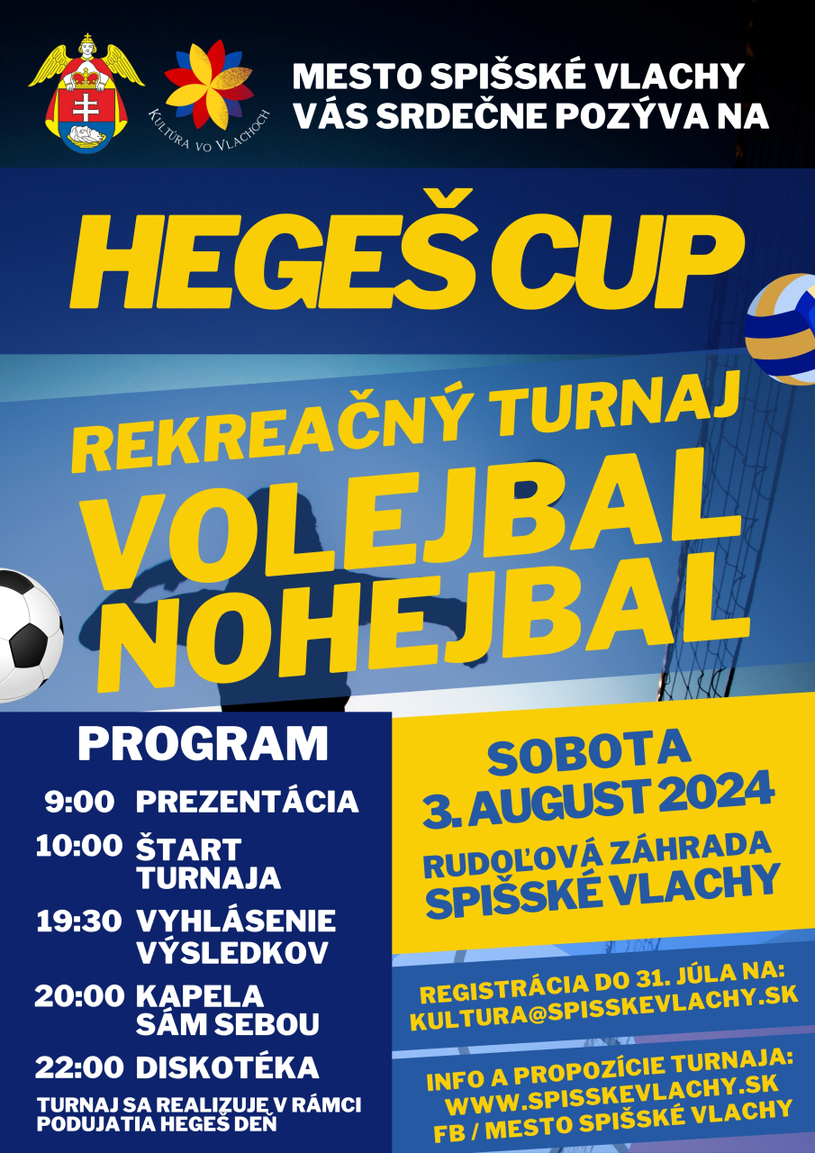 Mesto Spišské Vlachy srdečne pozýva všetkých milovníkov rekreačného športu na VOLEJBALOVÝ a NOHEJBALOVÝ TURNAJ – HEGEŠ CUP 2024, ktorý sa uskutoční v rámci podujatia HEGEŠ DEŇ 2024, v sobotu, 3. augusta, v Rudoľovej záhrade. Neváhajte a príďte si rekreačne zašportovať. Ohľadom akýchkoľvek informácií nás kontaktujte na tel. č 0948 271 505. Bližšie info v propozíciách súťaže.