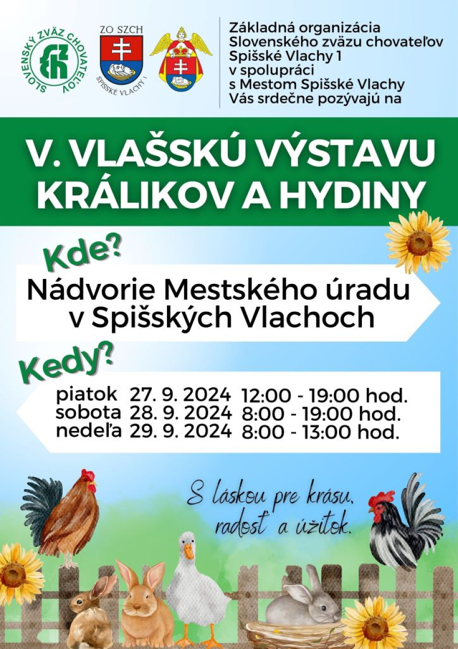 Už tradične na konci septembra organizujeme spoločne so Slovenským zväzom chovateľov Spišské Vlachy 1 obľúbenú výstavu králikov a hydiny. V. Vlašská výstava sa uskutoční v dňoch 27. - 29. septembra 2024 na nádvorí MsÚ. Výstava bude otvorená v časoch, ktoré môžete nájsť v priloženom plagáte.