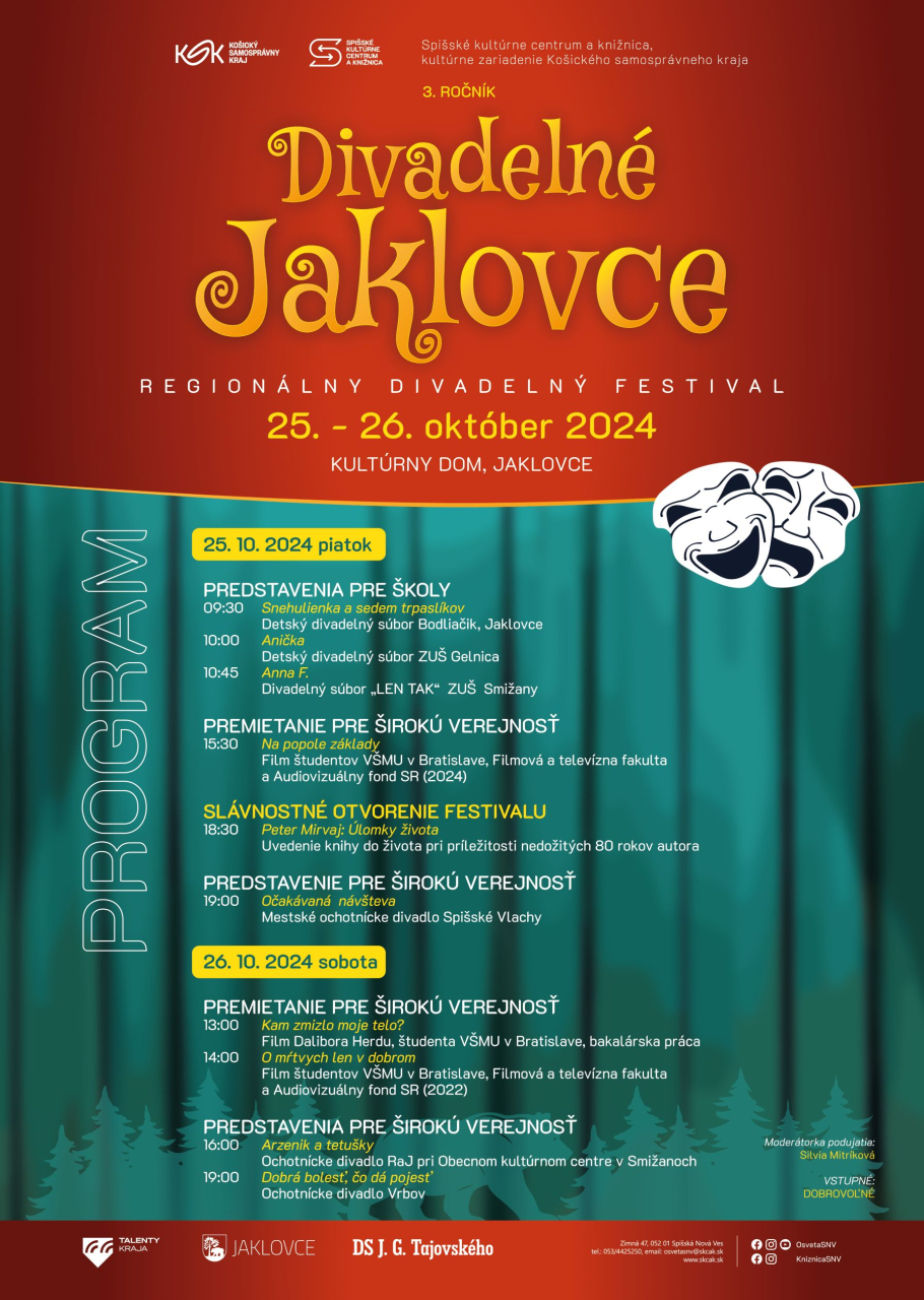 Mesto Spišské Vlachy Vás pozýva na divadelný festival DIVADELNÉ JAKLOVCE, kde sa vo festivalovom programe predstavia aj členovia Mestského ochotníckeho divadla Spišské Vlachy so svojou pôvodnou divadelnou hrou Očakávaná návšteva. Naše divadlo sa v rámci festivalu predstaví v piatok, 25. októbra 2024, o 19:00 hod. v Kultúrnom dome v Jaklovciach. Tešíme sa na Vás.