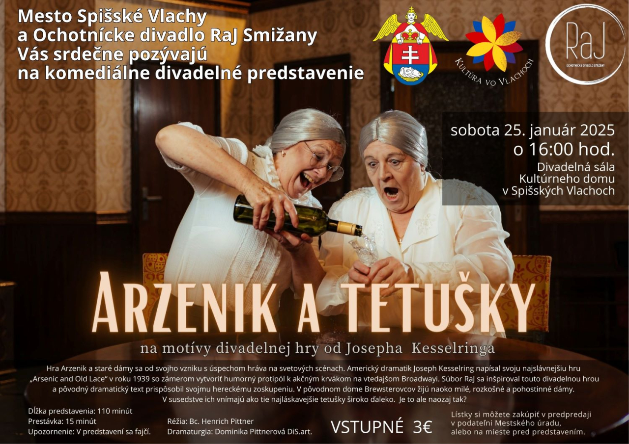 Vážení občania oznamujeme Vám, že plánované na divadelné predstavenie ARZENIK A TETUŠKY, ktoré mali ochotníci z neďalekých Smižian odohrať v Spišských Vlachoch v sobotu, 25. januára 2025, o 16:00 hod. je z dôvodu choroby ZRUŠENÉ!!
