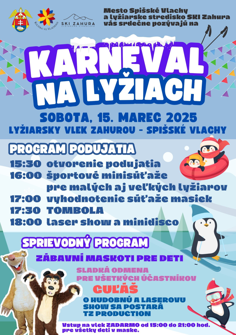 Mesto Spišské Vlachy a lyžiarske stredisko SKI Zahura srdečne pozývajú všetky deti a ich rodičov na KARNEVAL NA LYŽIACH, ktorý sa uskutoční v sobotu, 15. marca na lyžiarskom vleku Zahurou. Od 15:30 na Vás čaká úžasný program: športové minisúťaže, súťaž masiek, zábavní maskoti, TOMBOLA, laserová show a minidisco, občerstvenie, sladká odmena a guľáš. Od 15:00 do 21:00 hod. budú mať vstup na vlek zadarmo všetci, ktorí prídu s maskou.