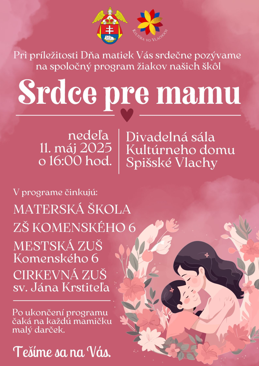 Mesto Spišské Vlachy Vás srdečne pozýva na spoločný program žiakov našich škôl, pod názvom „SRDCE PRE MAMU“, ktorý pripravuje pri príležitosti Dňa matiek. Program sa uskutoční v nedeľu, 11. mája 2025, o 16:00 hod., v Divadelnej sále Kultúrneho domu v Spišských Vlachoch. Po ukončení programu čaká na každú mamičku malý darček. Tešíme sa na Vás.