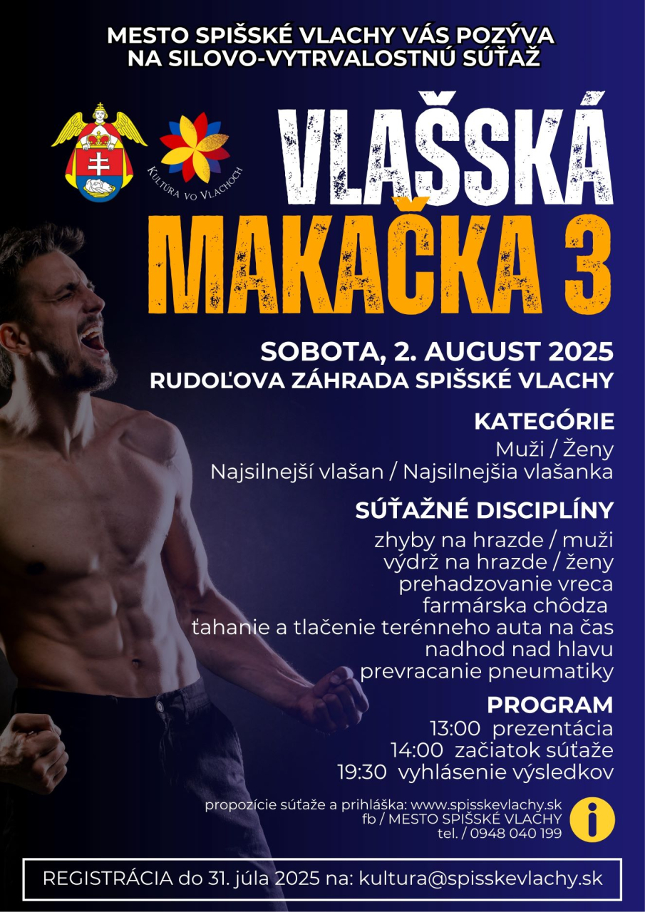 POZOR POZOR siláci a siláčky. Máme tu pre Vás výzvu. Už teraz sa môžete prihlasovať do našej silovo-vytrvalostnej súťaže VLAŠSKÁ MAKAČKA 3, ktorú pre Vás už tradične pripravujeme v rámci podujatia HEGEŠ DEŇ v Spišských Vlachoch, ktorý sa uskutoční v sobotu, 2. augusta 2025 v Rudoľovej záhrade. Ukáž aj TY, že si najsilnejší. Budeme súťažiť v rôznych silových disciplínach. Zapojiť sa môže každý. Oceníme tiež najsilnejšiu Vlašanku a najsilnejšieho Vlašana. TEŠÍME SA NA VÁS. Viac v prílohe.
