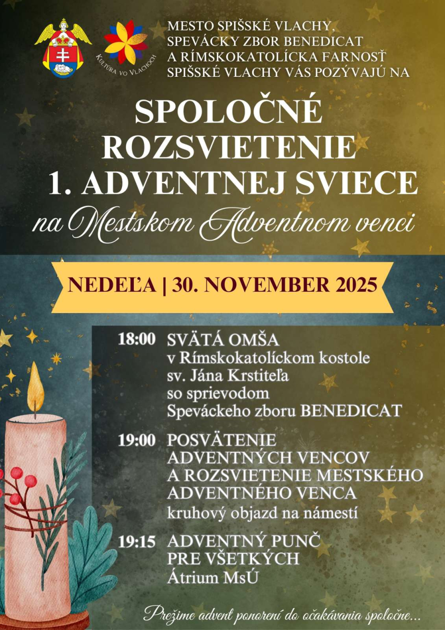 Mesto Spišské Vlachy Vás spoločne s Rímskokatolíckou farnosťou Spišské Vlachy a Chrámovým speváckym zborom Benedicat srdečne pozýva na spoločné rozsvietenie I. adventnej sviece na mestskom adventnom venci, ktoré sa uskutoční túto nedeľu, 30. novembra 2025.