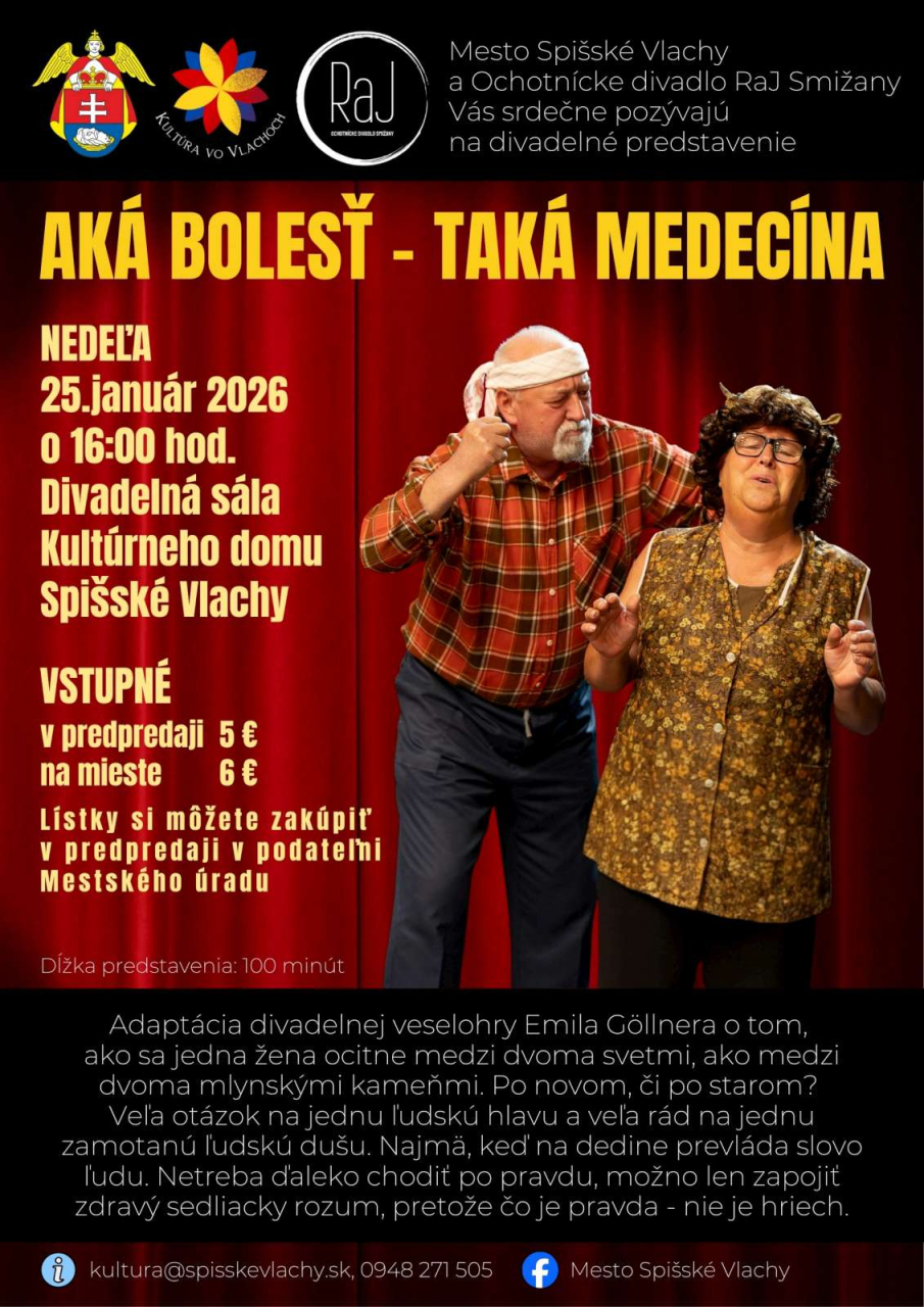 Mesto Spišské Vlachy a Ochotnícke divadlo RaJ Smižany Vás srdečne pozývajú na komediálne divadelné predstavenie „AKÁ BOLESŤ – TAKÁ MEDICÍNA“.