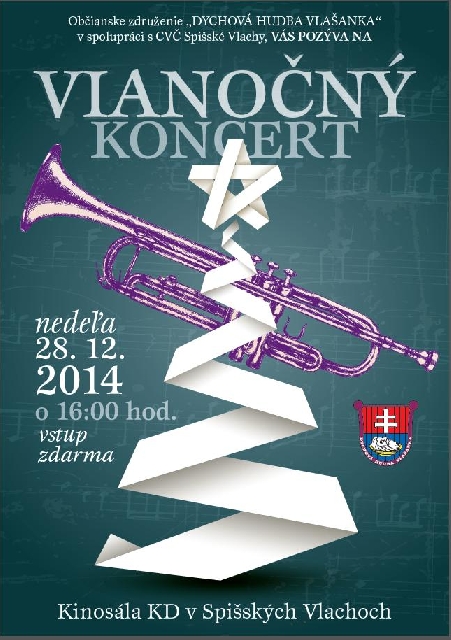 Občianske združenie "Dychová hudba Vlašanka" v spolupráci s CVČ Spišské Vlachy, Vás pozýva na VIANOČNÝ KONCERT, dňa 28.12.2014 (nedeľa) o 16:00 hod. v kinosále Kutlúrneho domu.