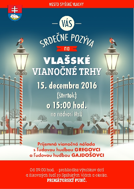 Mesto Spišské Vlachy Vás srdečne pozýva na Vlašské vianočné trhy vo štvrtok 15. decembra, nádvorie MsÚ Spišské Vlachy.