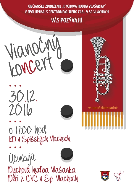 Príďte si oddýchnuť od vianočného varenia a pečenia a nalaďte sa s nami na Vianočný koncert, ktorý sa bude konať dňa 30.12.2016 o 17:00 hod. v KD v Spišských Vlachoch. Tešia sa na Vás Dychová hudba Vlašanka a deti z CVČ v Spišských Vlachoch.