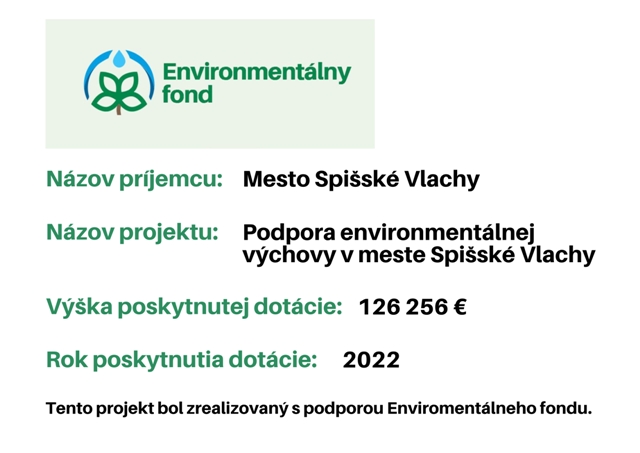 | Podpora enviromentálnej výchovy v meste Spišské Vlachy | Hlavnými prínosmi realizácie projektu bude dlhodobé riešenie aktuálnej problematiky v meste. Navrhnuté opatrenia sú efektívnym spôsobom ako zvýšiť environmentálne povedomie a podporiť činnosť smerujúcu k ochrane životného prostredia a trvalo udržateľnému využívaniu jeho zložiek a ochrane prírody v našom meste. Nakúpeným materiálno-technickým vybavením a následnou realizáciou edukačných a informačných aktivít dosiahneme ochranu životného prostredia a prispejeme k zvýšeniu environmentálneho povedomia a povedomia o ochrane životného prostredia. | 126 256 | ||