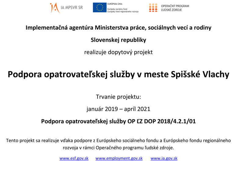 | Pokračovanie opatrovateľskej služby v meste Spišské Vlachy | Tento projekt sa realizuje vďaka podpore z Európskeho sociálneho fondu a Európskeho fondu regionálneho rozvoja v rámci Operačného programu ľudské zdroje | 106 080,00 | ||